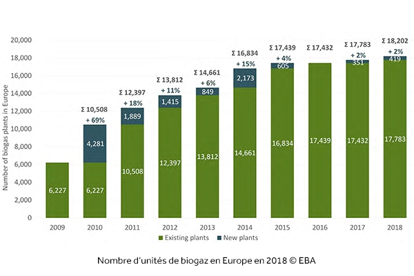 Tout secteur confondu, en 2018, l’Europe comptait 18.202 unités, soit une progression de 2 % par rapport à 2017. La majeure partie de ces unités sont équipées de cogénération, avec 11.082 MWél installés et produisent 63.511 GWhél. Le développement du biométhane continue, avec 660 unités installées (soit une progression de 13 % par rapport à 2017), qui produisent 2,28 milliards de m³ de biométhane.