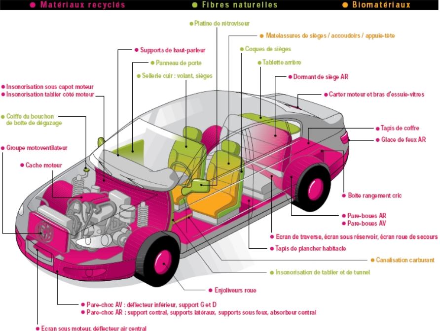 Source : Quels matériaux biosourcés pour l’automobile d’aujourd’hui et celle de demain ? – Présentation de Dr Stéphane Delalande (Direction des Matériaux et Procédés – Innovation, Groupe PSA) – https://www.critt.fr/