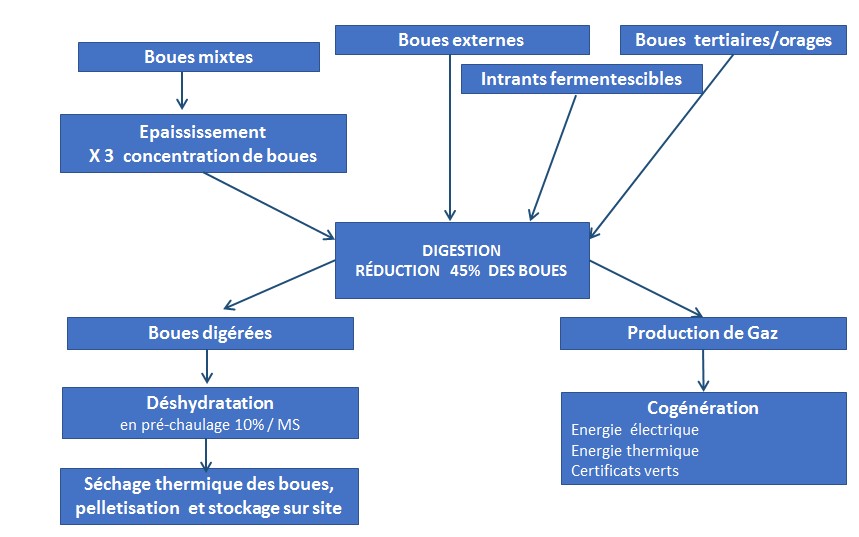- Méthaniseur : 800 m³ de boues digérées et 1.400 m³ de biogaz