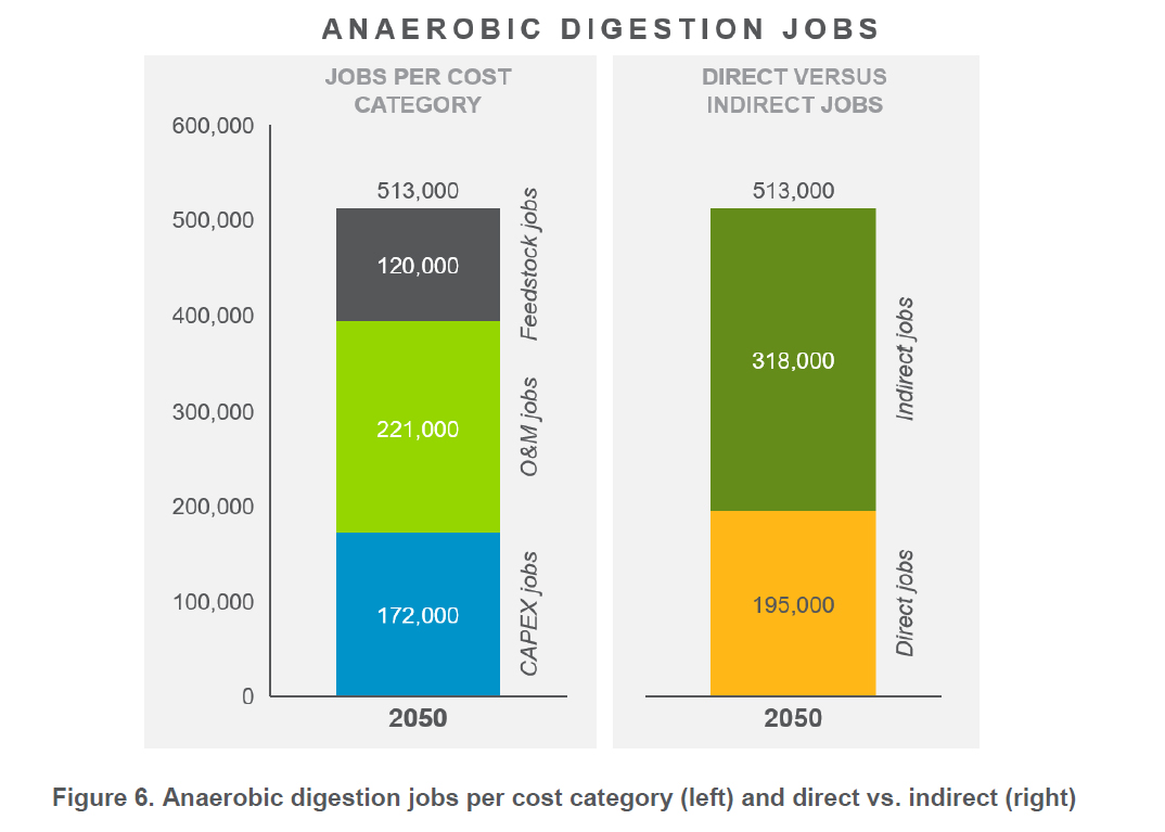 L'analyse présentée dans le rapport de Navigant[1] se base sur un objectif de 2,880 TWh produit par ses 3 sources de gaz vert d’ici 2050. Les résultats de l'analyse suggèrent les possibilités d'emplois directs dans certains secteurs économiques :