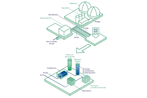 L’épuration du biogaz et son injection sur le réseau gazier sont des techniques répandues en France. Bien que la production du biogaz soit continue, l’injection du biométhane est quant à elle soumise aux besoins du consommateur. Celle-ci peut dès lors être fortement moindre en période estival ou durant les week-ends. La production de gaz non consommée est alors perdue. C’est ici qu’intervient la start-up française Azola. Grâce à un module plug&play, elle offre la possibilité de stocker le biométhane liquéfié.