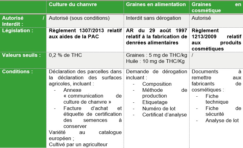 - Dû à la présence de THC, Cannabis sativa L. figure sur la liste 1 « Plantes dangereuses qui ne peuvent pas être utilisées en tant que ou dans les denrées alimentaires », reprise en annexe de l’arrêté royal du 29 août 1997 relatif à la fabrication et au commerce de denrées alimentaires composées ou contenant des plantes ou préparations de plantes. Le chanvre est donc interdit à la consommation alimentaire, sauf dérogation. La demande de dérogation doit contenir toutes les informations sur le produit, sa composition, sa méthode de production, son étiquetage, le numéro de lot et le certificat d’analyse correspondant.