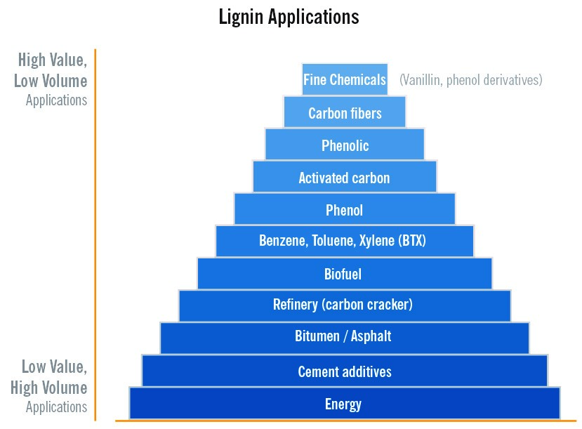 La valorisation de la lignine est prometteuse. Celle-ci pourrait substituer le pétrole dans plusieurs types d’applications. Parmi celles-ci :