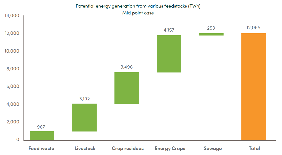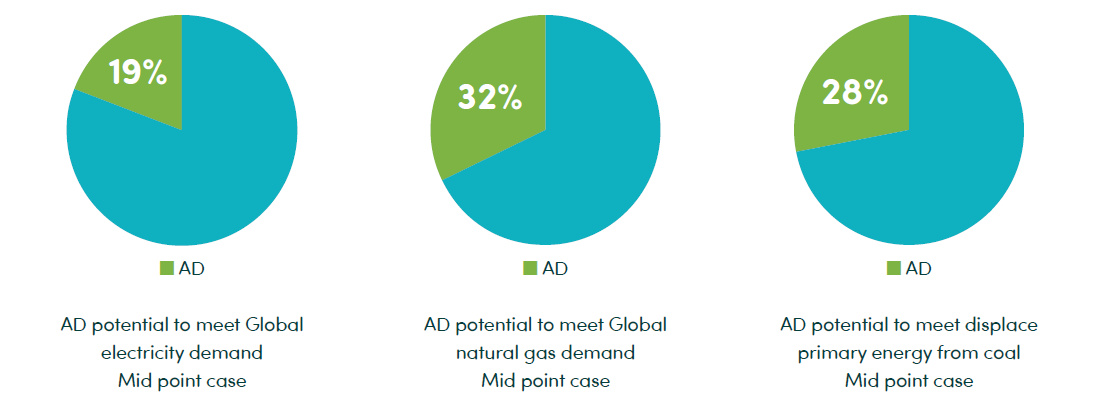 L’association a estimé qu’il serait possible de produire entre 10.100 et 14.000 TWh, via l’utilisation de déchets agro-alimentaires, d’effluents d’élevage, de résidus de cultures, de cultures dédiées, de boues et de décharges[3]. Cela représente environ 6 à 9 % de la consommation énergétique primaire mondiale.