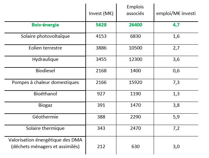 - le ratio du secteur bois-énergie était de 4,69 emplois dans la filière par million d’euros investi. Tandis que le ratio pour le secteur du photovoltaïque n’est que de 1,64…