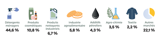 D’après le centre de recherche de la Commission européenne (Joint Research Centre)[4]., les tensioactifs constituent un secteur stable et mature en Europe. Cela s'explique par le fait que ces molécules ont de multiples applications dans presque tous les aspects de notre vie quotidienne grâce à leurs nombreuses fonctions : agents de solubilisation, moussants, mouillants, dispersants, émulsifiants… Elles sont donc largement utilisées dans la formulation de médicaments, cosmétiques, produits de nettoyage, additifs pour l'alimentation humaine et animale, produits agrochimiques, peintures, et également dans les technologies de remédiation environnementale, largement étudiées actuellement.