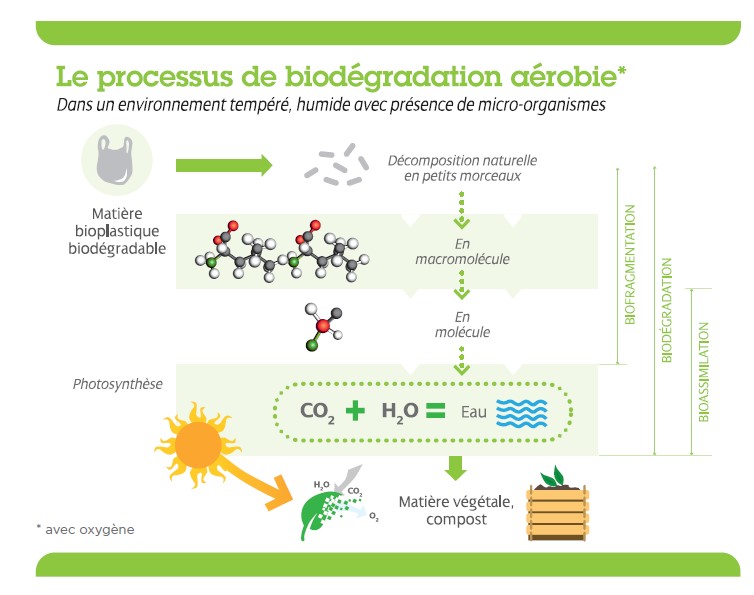 Un matériau est « biodégradable » s’il peut être décomposé sous l’action de micro-organismes (bactéries, champignons, algues, lombrics...). Le résultat est la formation d’eau (H2O), de dioxyde de carbone (CO2) et/ou de méthane (CH4), et de sous-produits (résidus, nouvelle biomasse) non toxiques pour l’environnement.