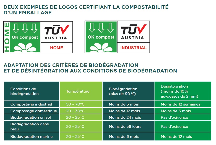 Il existe des labels spécifiques aux matériaux biodégradables qui garantissent leurs propriétés de biodégradabilité ou de compostabilité. Délivrées par des organismes de certification comme TÜV AUSTRIA ou Vinçotte.