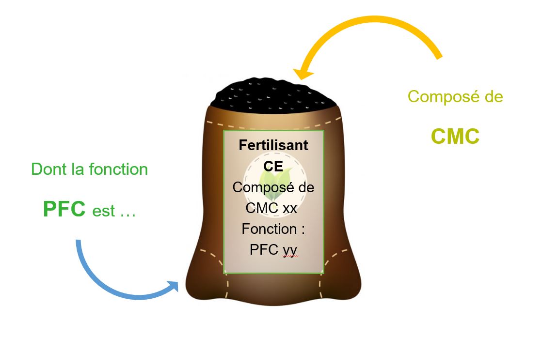 Chaque fertilisant est constitué d’une ou plusieurs matières constituantes (par exemple, de végétaux, de composts, de digestats, de minéraux, etc.) – répertoriées en CMC (Catégorie de Matières Constitutives) – et aura une fonction (engrais minéral, engrais organique, amendement du sol, support de culture, etc.) – répertoriée en PFC (Catégorie Fonctionnelle de Produit).