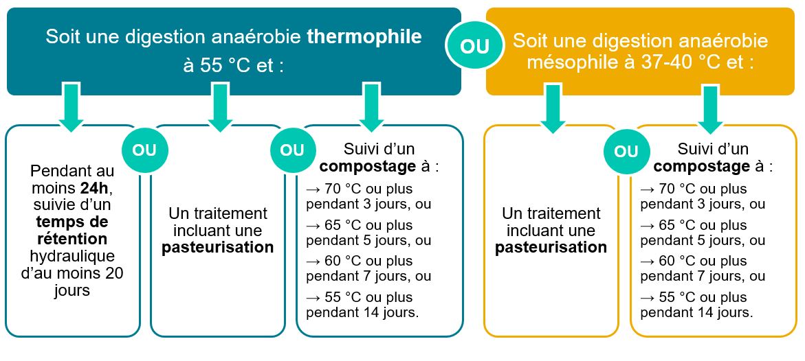 Dans le cas du digestat (CMC 4 et 5), chaque lot doit être correctement homogénéisé pendant le process et doit subir[7] :