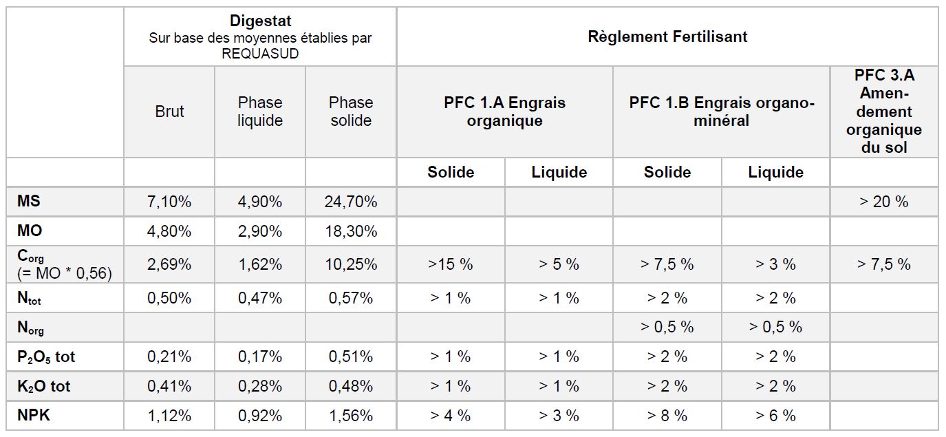 Sur base des chiffres moyens des digestats wallons (publiés par REQUASUD[9]), il est possible de voir si le digestat lambda répond à une ou plusieurs PFC. Les chiffres ci-dessous comparent les valeurs entre les trois formes les plus courantes de digestat (brut, phase liquide et phase solide), ainsi que les PFC pressenties.