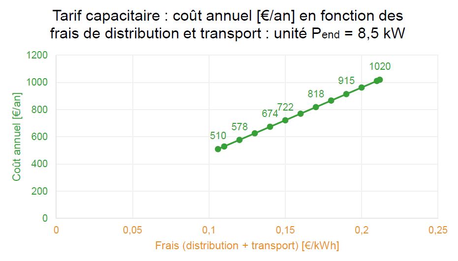 Le graphique présente l’évolution du coût annuel en fonction des frais de distribution et transport pour une unité ayant une puissance nette développable de 8,5 kW avec le tarif capacitaire. Pour une telle installation, ce tarif devrait coûter entre 510 et 1020 €/an, en utilisant la gamme de prévisions de la CWaPE sur les frais de distribution et transport.