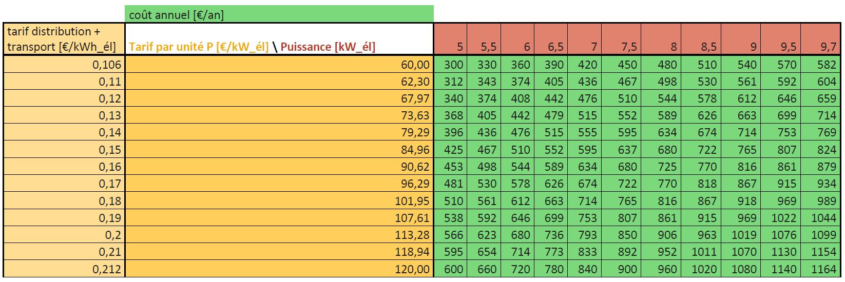 Dans le tableau se trouve l’évolution des coûts annuels en de la puissance nette développable de l’installation et des frais de distribution et transport des GRD avec le tarif capacitaire.