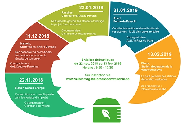 Le Tour se tient du 22 novembre 2018 au 13 février 2019. Au total, il compte 5 visites thématiques, réparties sur toute la Wallonie. La formule est identique pour chaque visite : une matinée de conférences suivie de la visite d’une installation, avec – notamment – le témoignage du porteur de projet.
