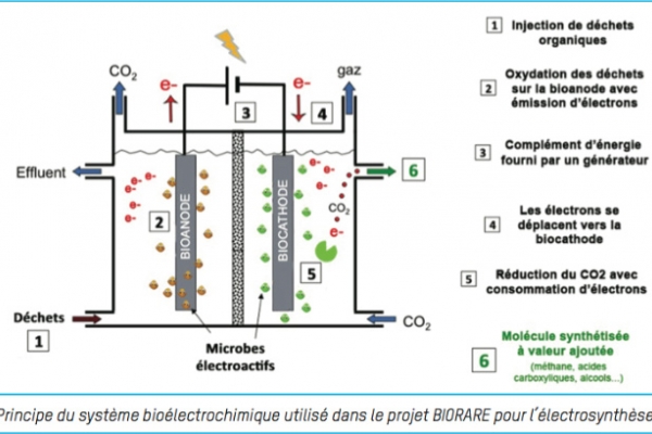 Le principe de l’électrosynthèse microbienne consiste à exploiter des bactéries électroactives qui génèrent un transfert d’électrons depuis une bio-anode (où sont injectés les biodéchets hydrolysés) vers une bio-cathode où l’activité microbienne libère des molécules organiques d’intérêt.